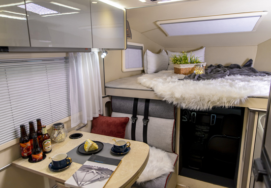 與自行式A型房車相比,自行式C型房車空間稍顯不足,但又比自行式B型房車空間寬敞、設備齊全--起居室、廚房、盥洗室、臥室具有大量櫥柜,攜帶大量行李絲毫不成問題。同時車內具有影音娛樂系統、空調、可轉化桌沙發椅等,總而言之,自行式C型房車是安裝在車輪上的空間緊湊、設備齊全的房車類型。